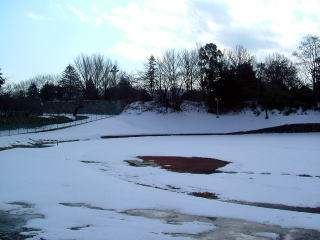 そこから歩いて陸上競技場に向かう途中、城址のお堀の横を通るとほとんど凍っていて、なかなか幻想的な光景であった。
