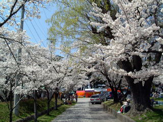 通路には花見客の車でいっぱい。これでは今頃来ても、車が置けるはずもない。