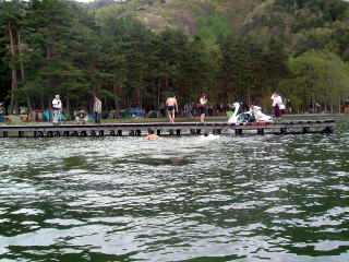 すると海パンになって、なんと木崎湖に入って泳ぎ始めるではないか!。